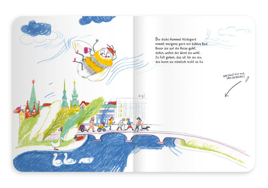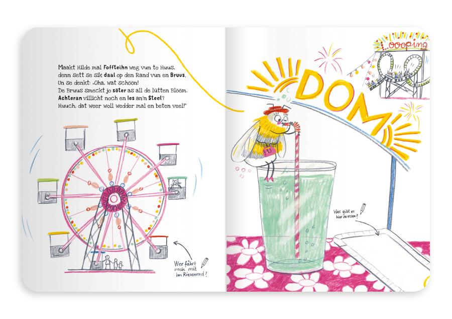 Morgenbad in der Alster, op ’n Swutsch in Planten un Blomen und Söötkraam snabbeln op ’n Dom: Hummel Hilde nimmt uns mit »op ehr Tour dörch Hamborg«, denn sie ist eine Hummel, die Plattdeutsch spricht. Dabei lernen kleine Leserinnen und Leser nicht nur viele Hamburger Orte und Schnacks kennen, sondern können das Buch auch selbst mitgestalten. Dazu geben die kindlich-lustigen Illustrationen von Nele Palmtag vielfältige Anregung, und die plattdeutsche Sprache lernt sich beim Mit- und Weitermalen ganz nebenbei. Nämlich so: Zuerst wird die Geschichte einmal laut op Platt vorgelesen, was sehr lustig klingt, wenn man es zum ersten Mal hört oder liest. Beim Mitgestalten der Bilder wird dann die Beschäftigung mit der Sprache vertieft, und die kleinen Künstlerinnen und Künstler können, u.a. mithilfe eines Glossars und Hinweisen zur Aussprache, schauen, was sie schon verstanden haben. Erst ganz zum Schluss wird die Geschichte dann noch mal auf Hochdeutsch gelesen und das eigene Bilderbuch vollendet.